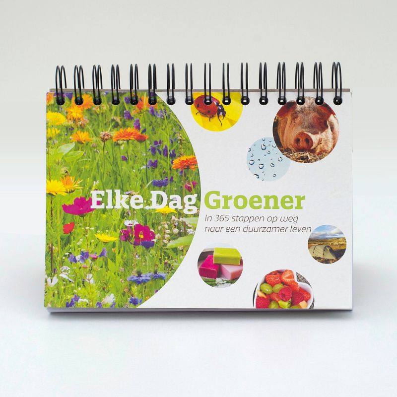 In de bundel Elke Dag Groener, in 365 stappen op weg naar een duurzamer leven geef ik je, inderdaad, 365 tips die supermakkelijk door te voeren zijn in jouw leefstijl en die juist geld besparen. Deze duurzame kalender is geen scheurkalender. Om verspilling tegen te gaan is de kalender zo ontworpen dat deze jaar in jaar uit te gebruiken is. En dat is ook de beste manier om hem te gebruiken. Want niet alle tips zul je in een keer doorvoeren. Soms ben je er nog niet klaar voor. Soms is het geen prioriteit. Of heb je gewoon geen tijd. Het maakt allemaal niet uit: volgend jaar komen alle tips opnieuw voorbij. De kalender heeft een speciale ruimte om je persoonlijke doelen bij te houden.